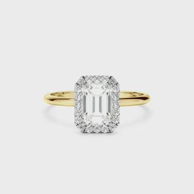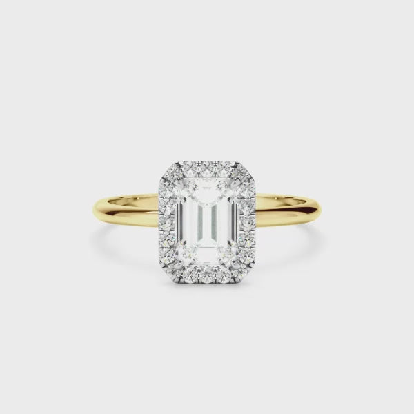 This timeless custom-made engagement ring, made with your choice of diamond centre stone, features an emerald cut diamond adorned in a halo of round brilliant cut diamonds. Exuding fluidity in its line work, and boasting an elegant silhouette, as with all the pieces in our Bespoke Collection, this piece is made especially for you.