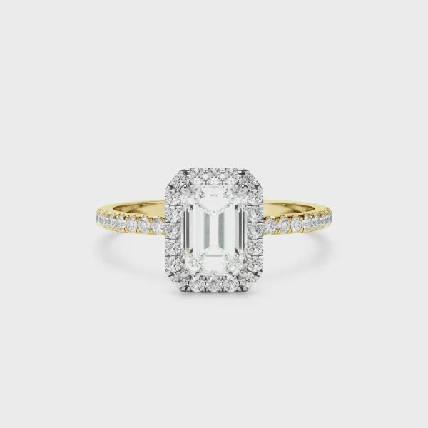 Emerald Cut Diamond Halo Engagement Ring With Pave Band