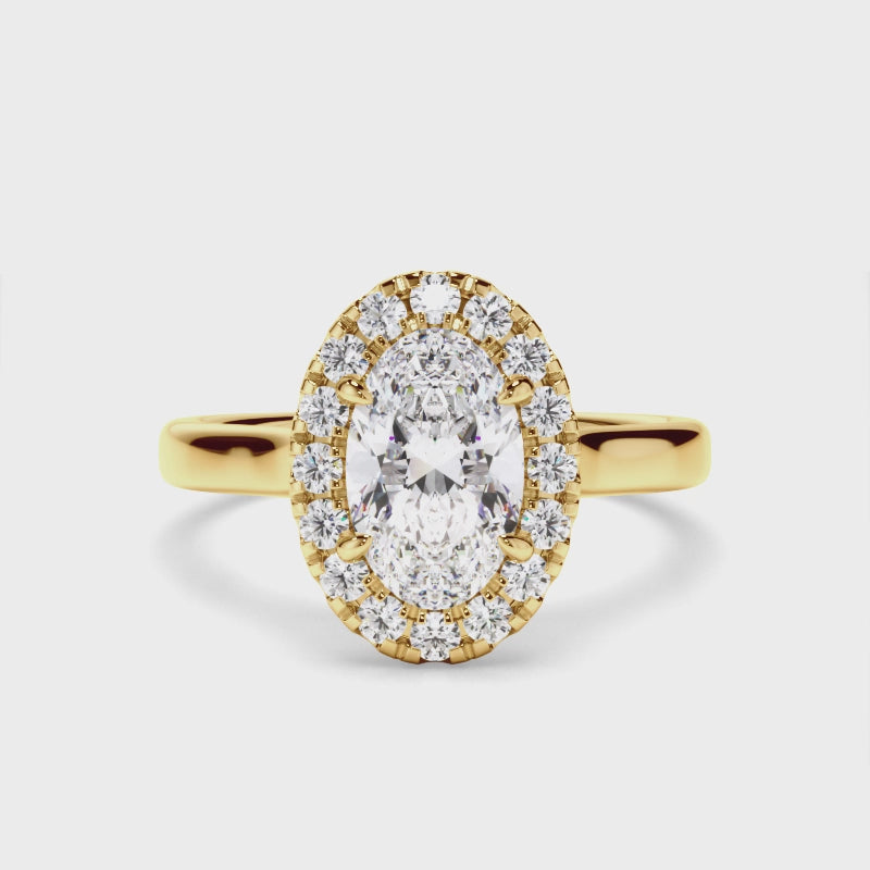 This timeless custom-made oval cut diamond engagement ring, made with your choice of diamond centre stone, features a diamond halo set in a classic half round band. Exuding fluidity in its line work, and boasting an elegant silhouette, as with all the pieces in our Bespoke Collection, this piece is made especially for you.
