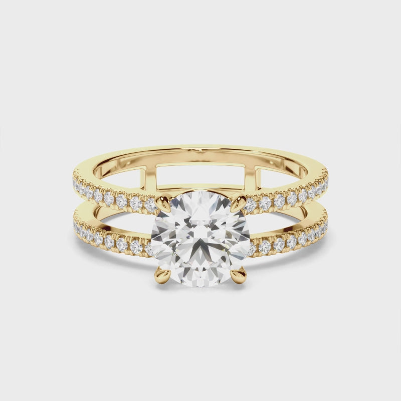 This timeless custom-made round brilliant cut diamond engagement ring, made with your choice of diamond centre stone, features two rows of pave diamonds across a half round split band. Exuding fluidity in its line work, and boasting an elegant silhouette, as with all the pieces in our Bespoke Collection, this piece is made especially for you.