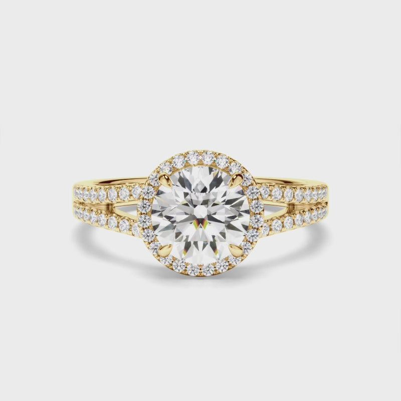 This timeless custom-made round brilliant cut diamond halo engagement ring, made with your choice of diamond centre stone, features two rows of pave diamonds across a square split band. Exuding fluidity in its line work, and boasting an elegant silhouette, as with all the pieces in our Bespoke Collection, this piece is made especially for you.